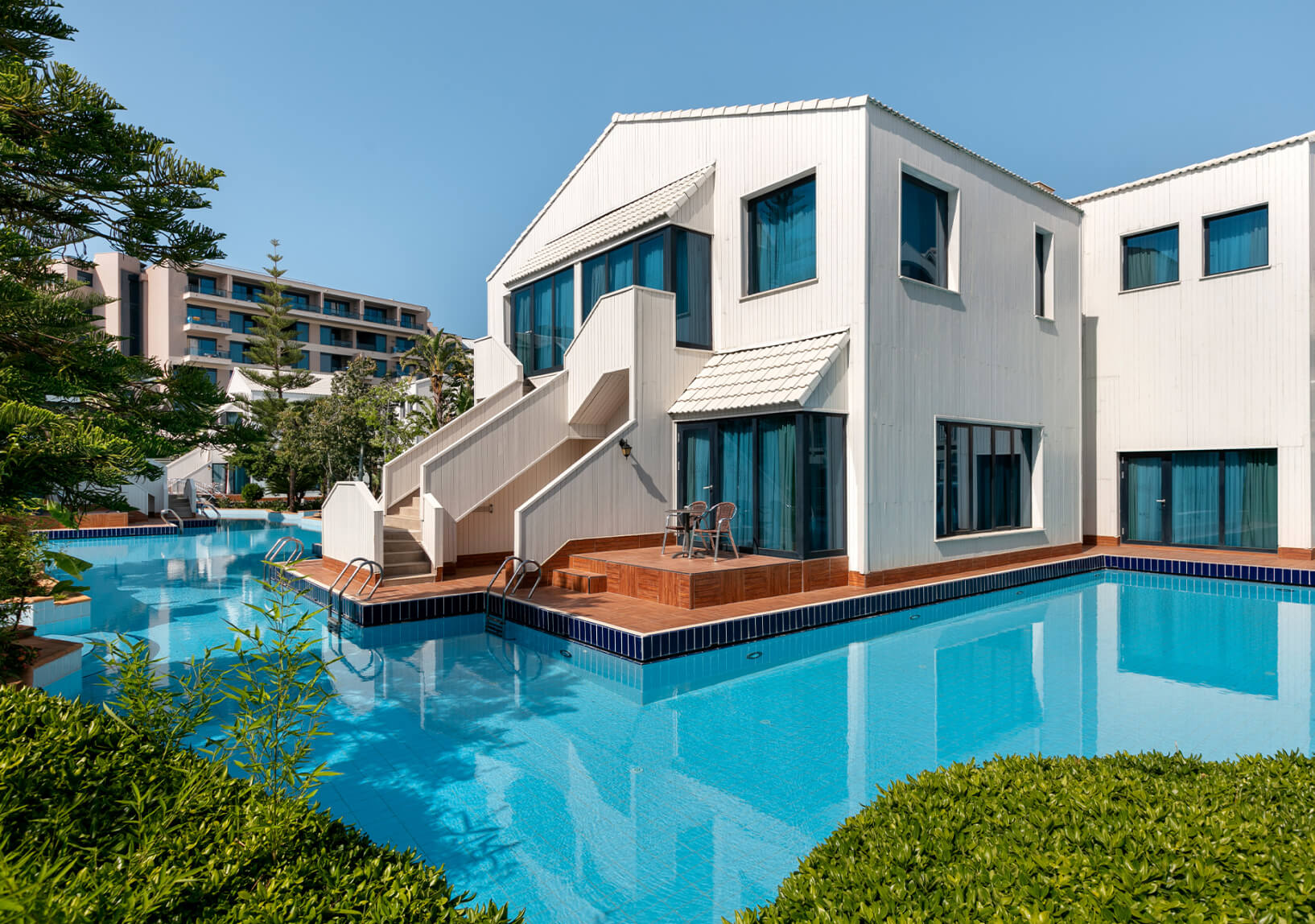 Standart oda anlayışının ötesine geçen bu özel konsept tatilde yalnızca konaklama değil, başlı başına bir yaşam alanı arayan misafirler için güçlü bir alternatif oluyor. Ana binadan bağımsız olarak konumlanan yapılar, kalabalık otel dinamiğinden uzaklaşarak daha sakin, kontrollü ve kişisel bir tatil deneyimi vadediyor.